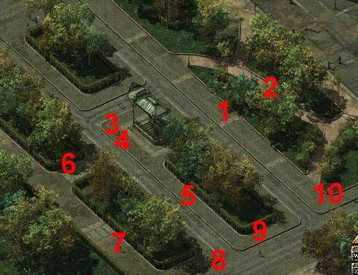 Die Gruppe Wachen, die bei 1 rumlungert, wird um die Ecke