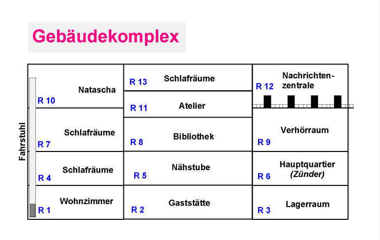 Der Hauptschalter befindet sich im rechten Gebäudekomplex, im 1. OG. Im Erdgeschoß lungern