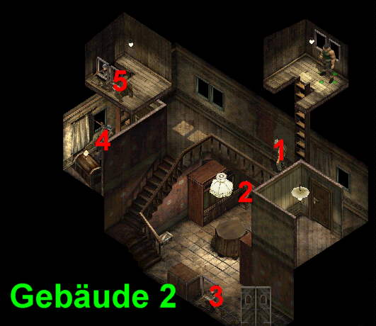 Über die Leiter kann man ins Dachgeschoß klettern. Die beiden Wachen dort oben sind ein Witz.