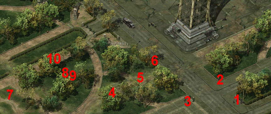 Die Gruppe Wachen, die bei 1 rumlungert, wird um die Ecke