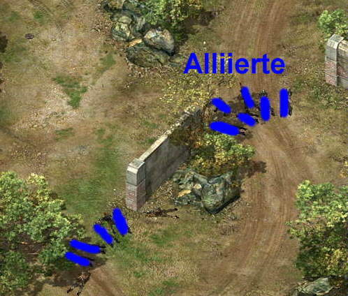 Nun baut man sich mit den Alliierten eine Mauer auf, in liegender Haltung. Da sie Gewehre und